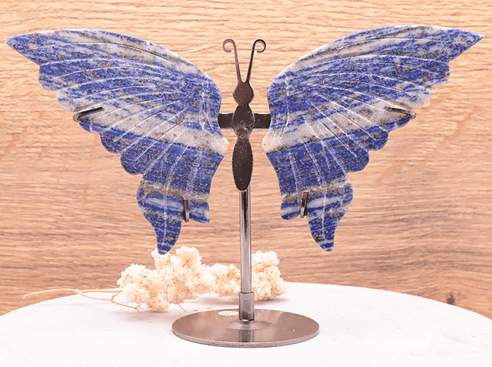 Définition : La classification A indique que le lapis lazuli utilisé est de bonne qualité, avec une belle couleur bleu profond et une clarté satisfaisante. Cela signifie que le papillon sera esthétiquement plaisant et bien fini.